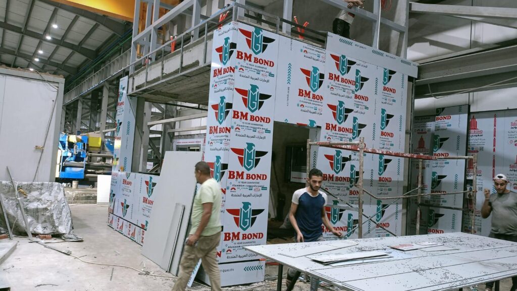 تركيب ألواح كلادينج بألوان معدنية تتناسب مع هوية المصنع.