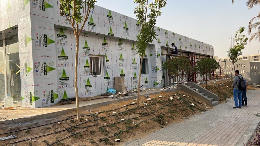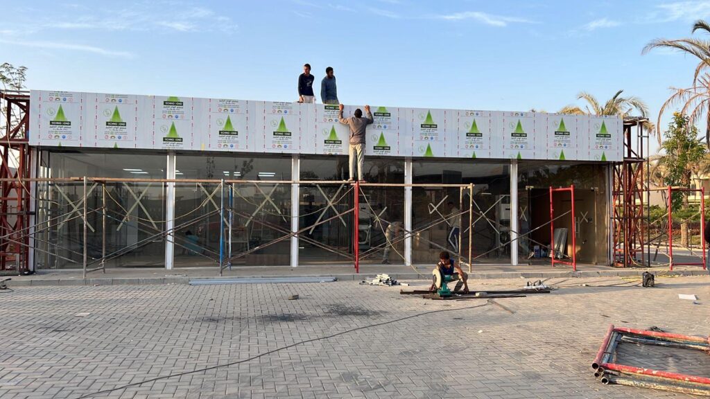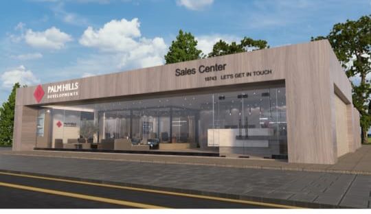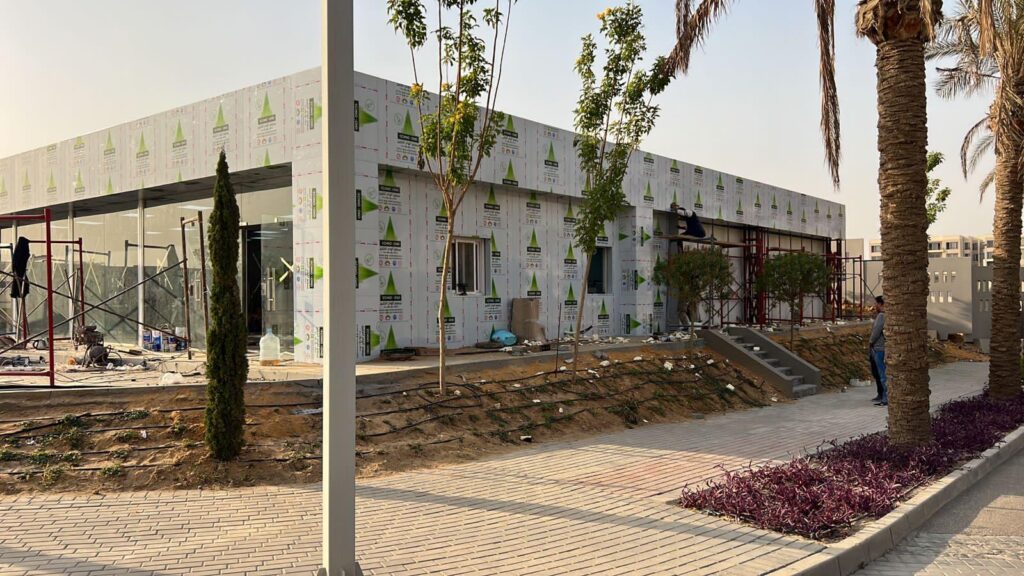 قامت شركة الشروق للمقاولات وتوريد ألواح الكلادينج بتنفيذ أعمال الواجهات الخارجية لـ مركز مبيعات شركة بالم هيلز.